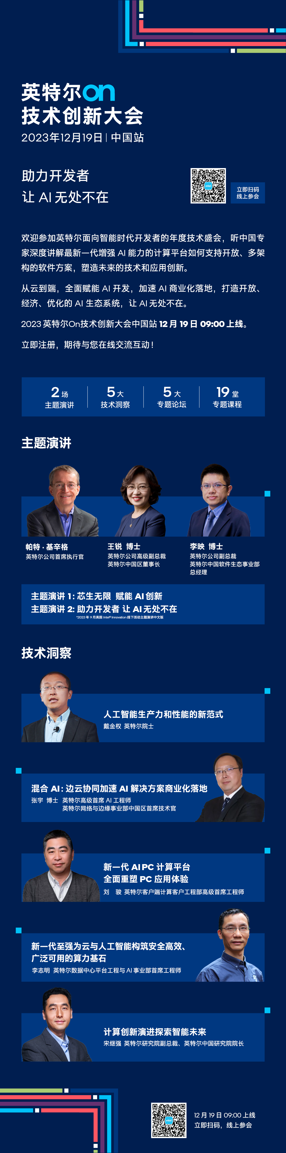 2023 英特尔 On 技术创新大会中国站即将于 12 月 19 日线上举办。大会将有 2 场主题演讲、5 大技术洞察、5 大专题论坛、19 堂专题课程,深度讲解最新一代增强 AI 能力的计算平台如何支持开放、多架构的软件方案,塑造未来的技术和应用创新。