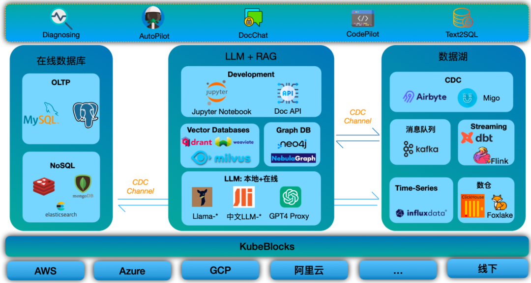 KubeBlocks 作为开源管控平台,可运行和管理 K8s 上的数据库、消息队列及其他数据基础设施。基于这一特点,KubeBlocks 的解决方案采用托管向量数据库(如 Milvus)和图数据库(如NebulaGraph)的方式,实现多云和线下部署,在实现快速 day-1 集成的同时,也提供了丰富的 day-2 运维操作。