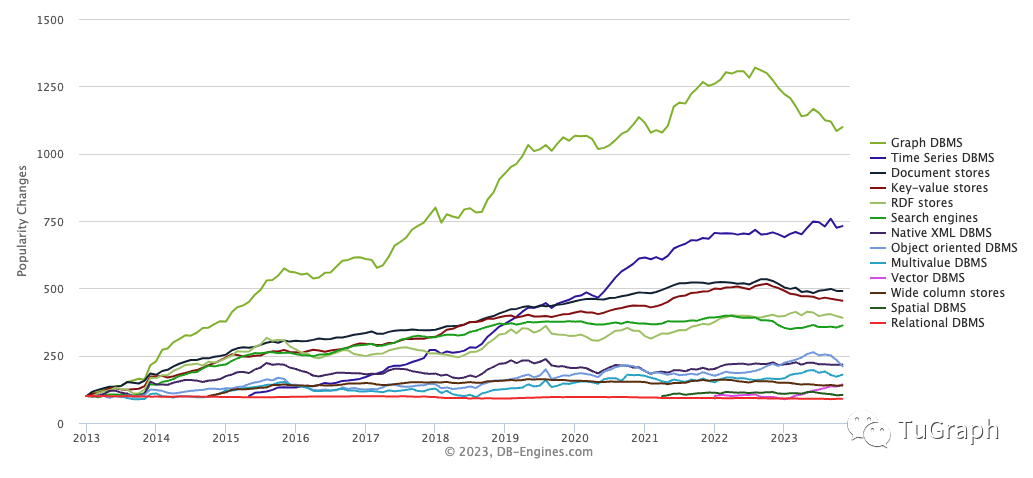 在设计数据存储引擎时,需要考虑众多因素。例如,所应用的具体场景,是联机分析处理(OLAP)还是联机事务处理(OLTP);再如,数据存储方式的选择,内存、本地硬盘或分布式存储;还有就是存储数据的格式,像是文档、JSON,宽表,对象,键值对等。图存储引擎是诸多数据存储引擎中的一种,它专门用于图数据的存储。从DB-Engines网站的统计来看,Graph DBMS的热度从2014后一直领先其他类型数据库。