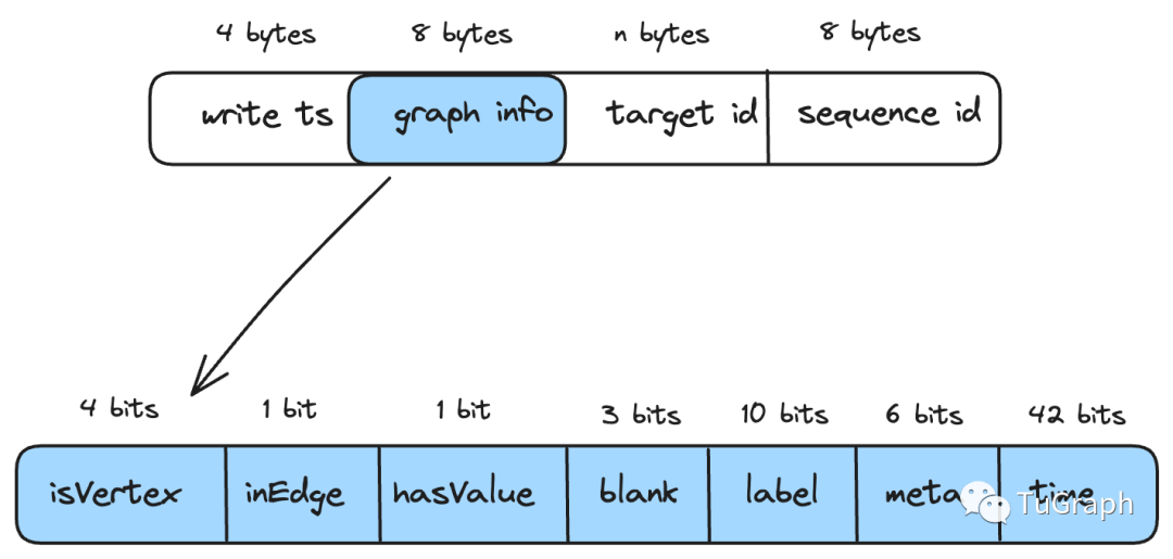 SecondKey编码格式如下,target id大小不固定,其他部分消耗20 bytes。write ts字段记录数据写入时间,被用于数据淘汰,sequence id记录了数据写入顺序,transaction和compaction都会用到。graph info记录是否是点,是否是入边,是否包含属性,标签,其他meta, 点边时间属性等信息。