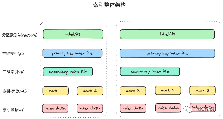 二级索引包括min max索引,bloom filter索引等,用于快速判断某个稀疏索引块是否包含某个主键。min max索引记录某个索引块的上界和下界,bloom filter记录索引块的主键。