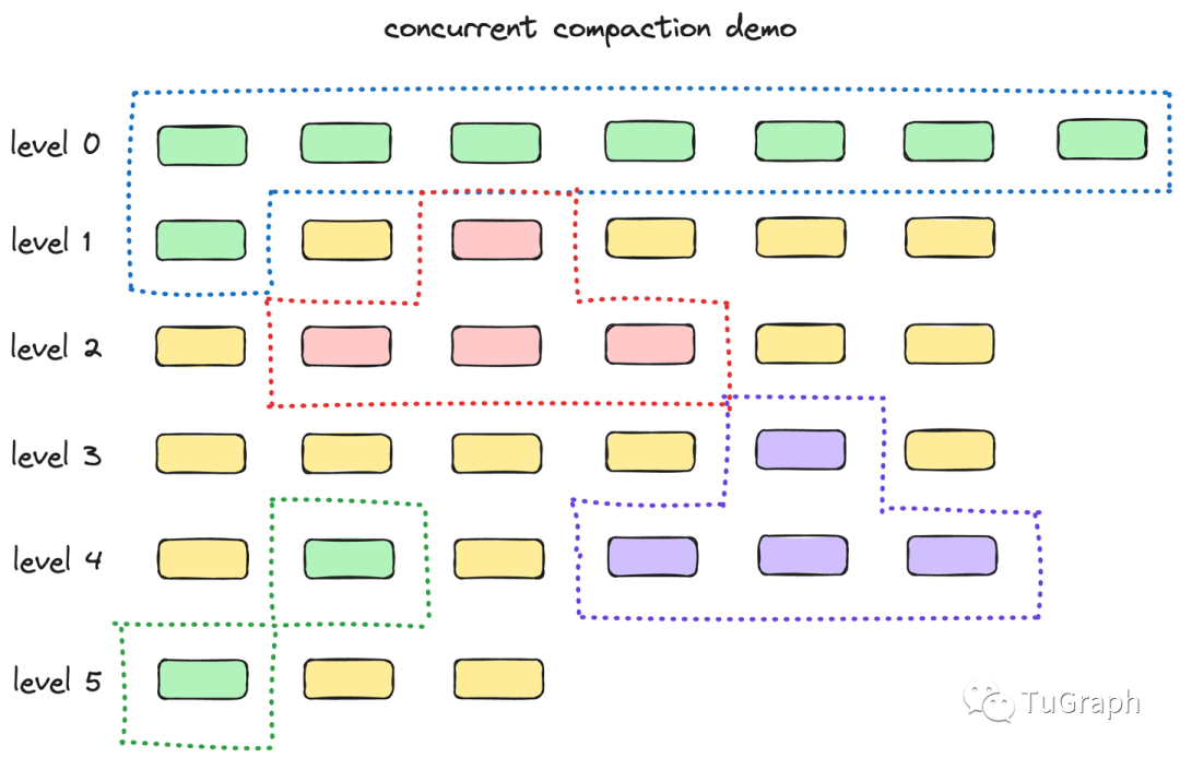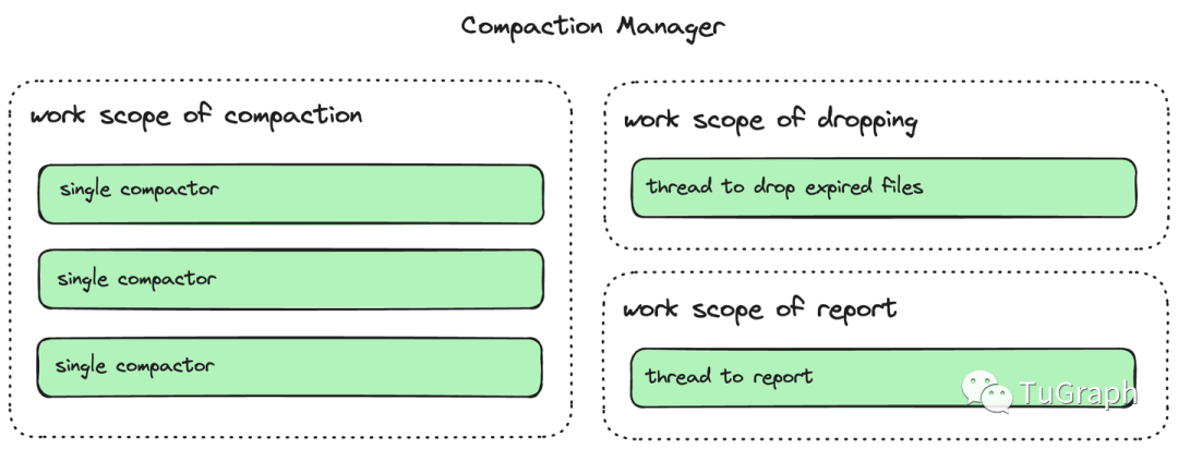 为了加快 LSM-Tree compact的性能,CStore 支持单层的多线程compact。在示意图中,每一个单独的compactor都代表一个compact工作线程。不同的compactor线程和compact清理线程(负责清理被compact的文件)将会并行执行。