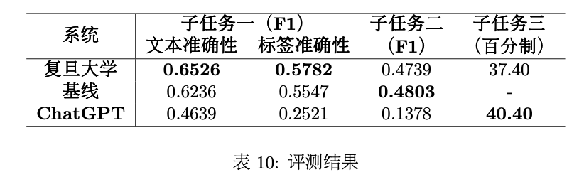 SpaCE2023测试了GPT3.5版本的ChatGPT在数据集上的表现。子任务一的指令说明了S- P-E标注法。受限于ChatGPT可接受的输入长度,我们提供了5条样例帮助模型理解任务目标和 输出格式,这5条样例涵盖了5种语料来源和6种文本片段。子任务二的指令说明了15个元素的概 念,提供了3条样例,涵盖3种语料来源和9个元素。子任务三则直接提供10个样例以供学习,每 个样例包括语料文本、判断结果和按模板编写好的判断理由。样例涉及处所、方向、终点、位 置关系这四个要素,含5条正例和5条负例。对于子任务一和子任务二的输出,我们发现文本片 段的下标存在很多错误,所以用程序重新寻找了每个文本片段的下标。