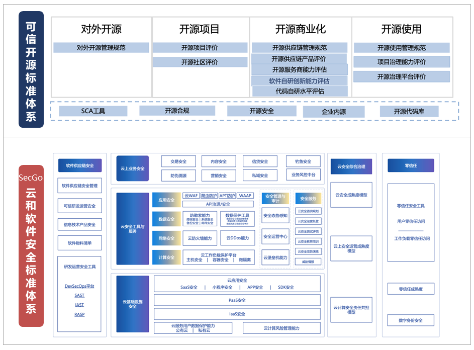 中国信通院面向安全供应侧和用户侧,建立“SecGo云和软件安全”评估体系,从软件供应链安全、云安全、零信任、业务风控、安全保险多个领域,建立事前、事中、事后全链条安全体系。