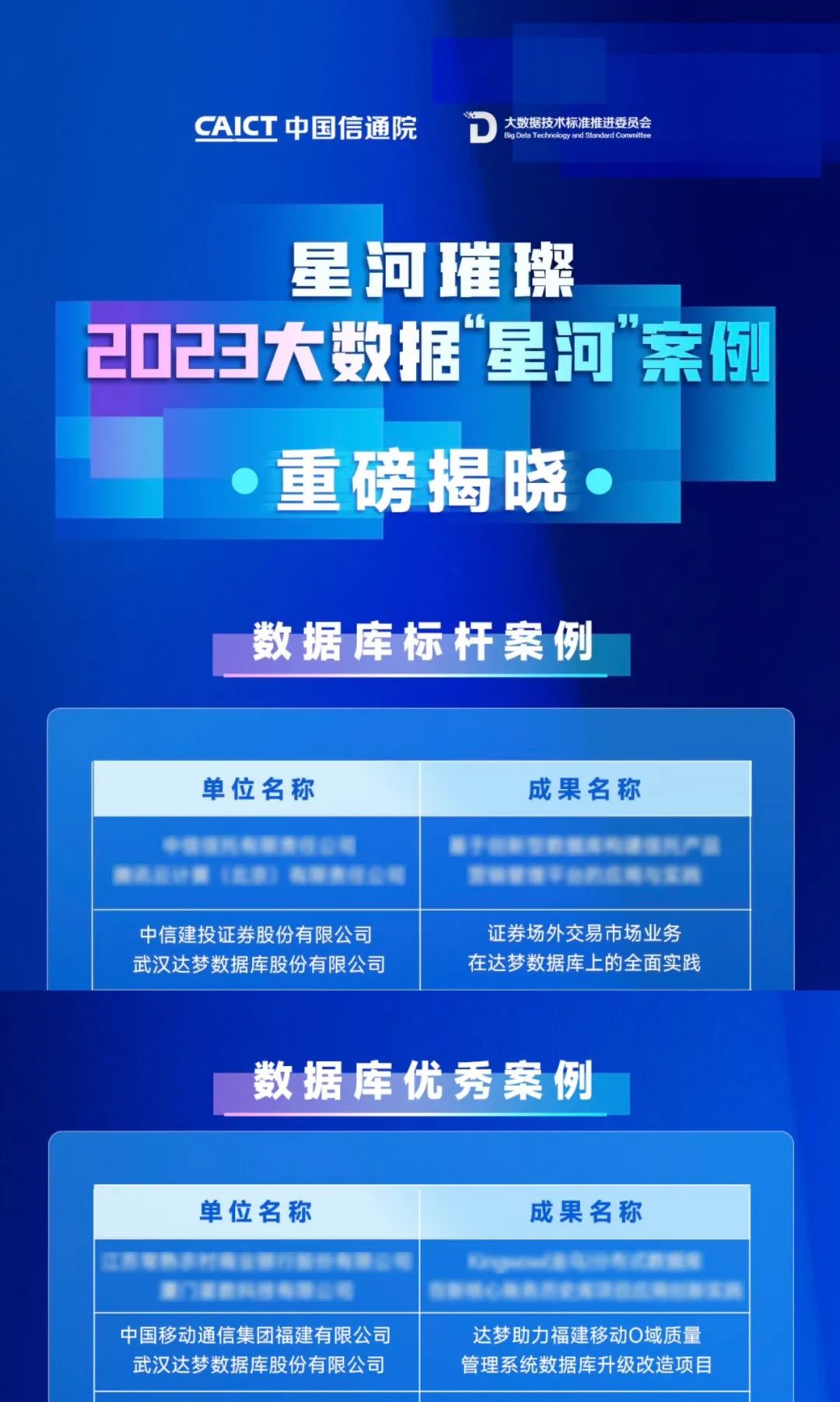 近日,中国信息通信研究院、中国通信标准化协会大数据技术标准推进委员会(CCSA TC601)连续七年共同组织的大数据“星河(Galaxy)”案例征集活动发布公示——达梦数据支持完成的中信建投证券股份有限公司“证券场外交易市场业务在达梦数据库上的全面实践”、中国移动通信集团福建有限公司 “达梦助力福建移动O域质量管理系统数据库升级改造项目 ”分别入选数据库标杆案例、数据库优秀案例。