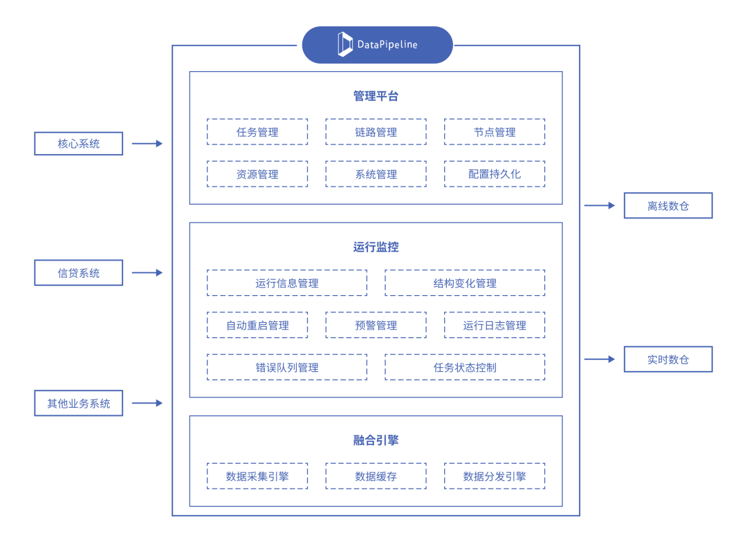 DataPipeline 适配了富民银行Oracle、MySQL、Hive在内的多种数据库管理技术,可实现信贷系统、风控额度、会员系统数据的实时同步,在数据一致性、处理速度和系统稳定性方面较之前有大幅提升。