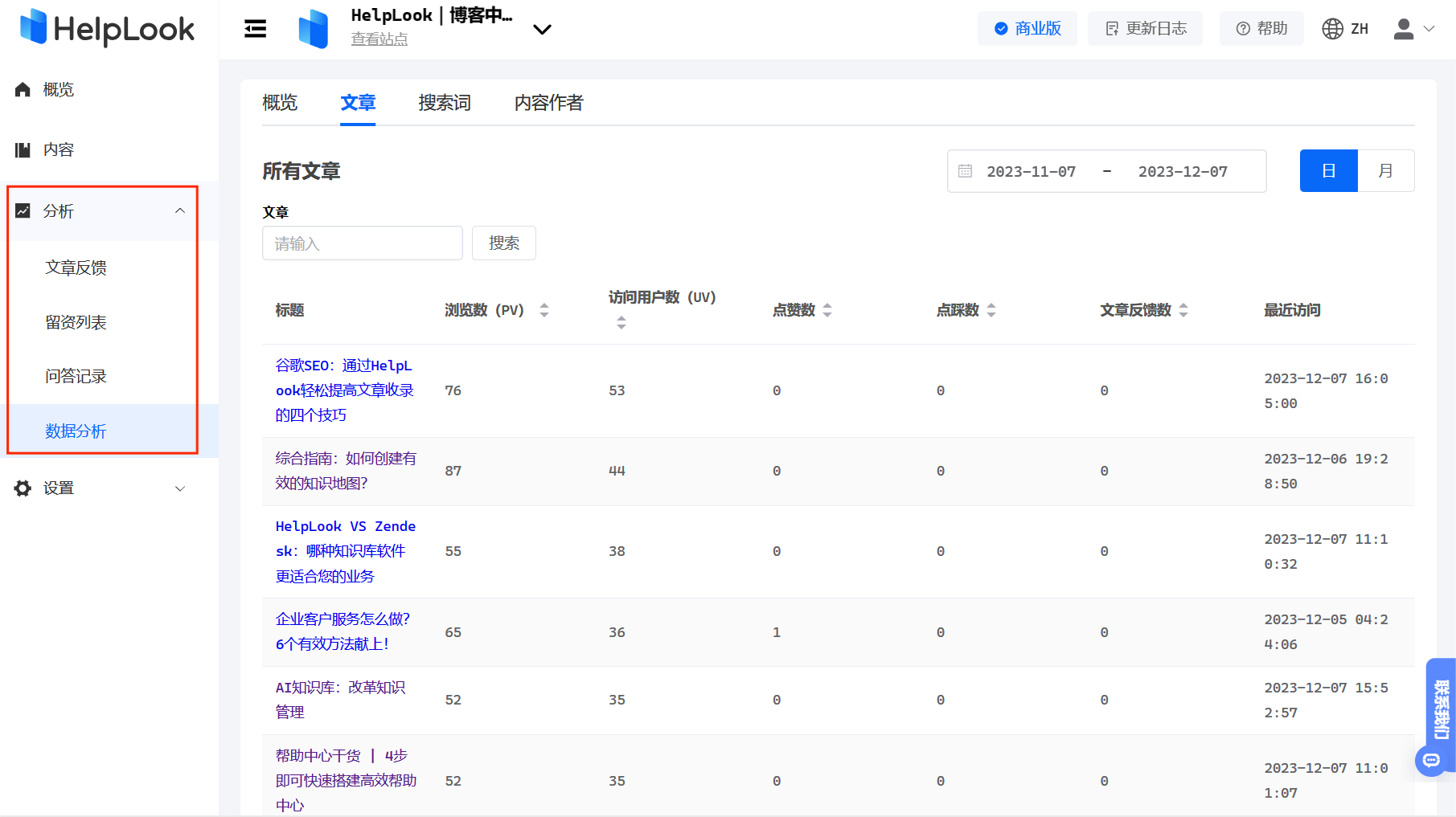 HelpLook提供了统计和分析功能,可以追踪和评估知识库的使用情况。通过分析数据,可以了解哪些知识受到关注,哪些知识需要更新或补充,从而改进知识管理的效果。
