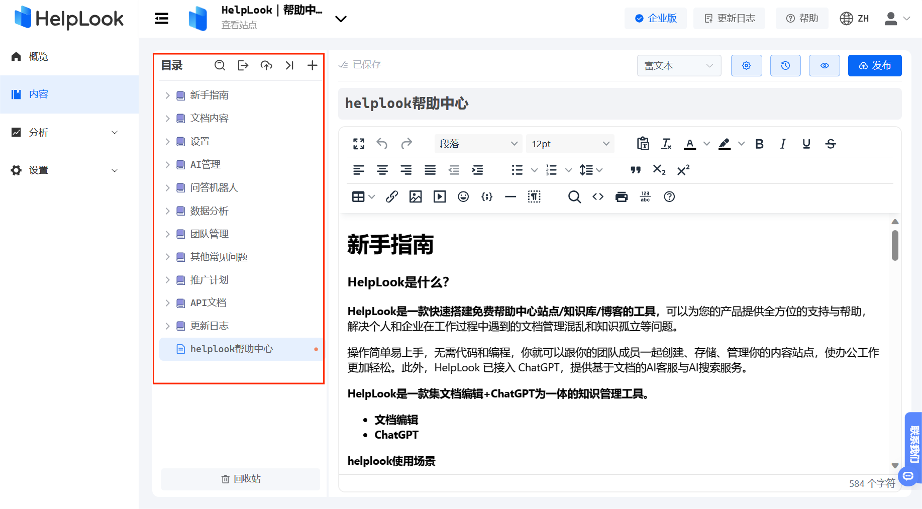 在知识库中,可以使用分类和标签来对知识进行分类和组织。而通过HelpLook可以结构化内容管理和进行在线存储。其支持集目录、栏目、文档为一体的无限制层级设置,草稿与已发布两种文章状态灵活切换,随时可以进行文章的修改和上架,内容状态一目了然,使管理文档更加轻松。