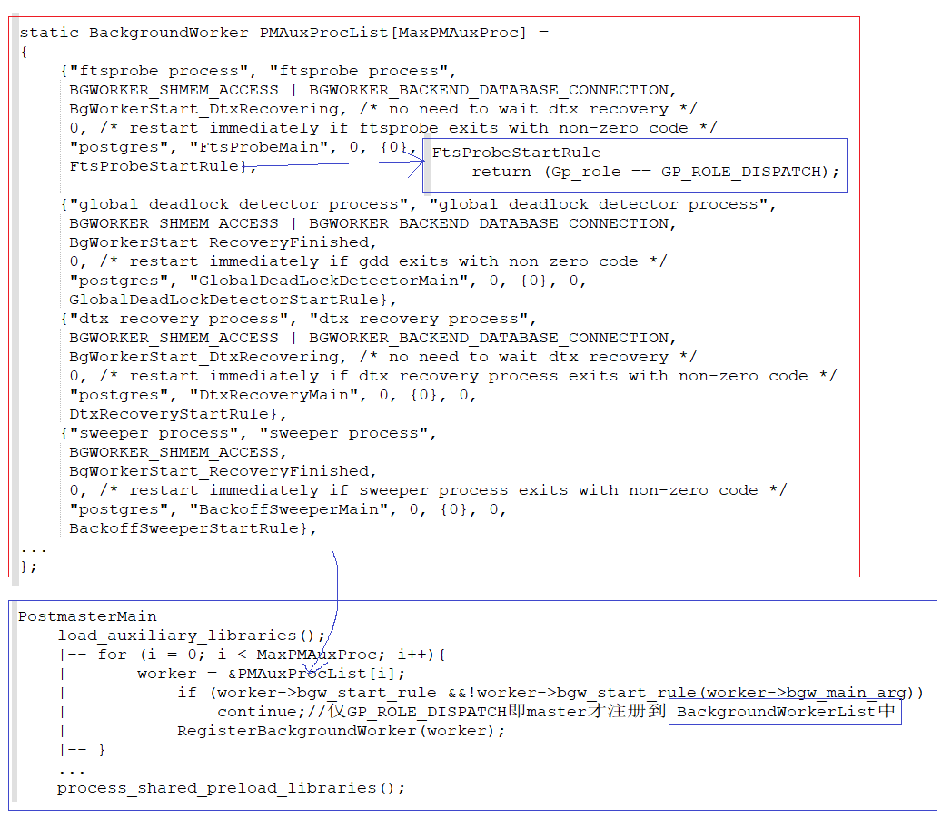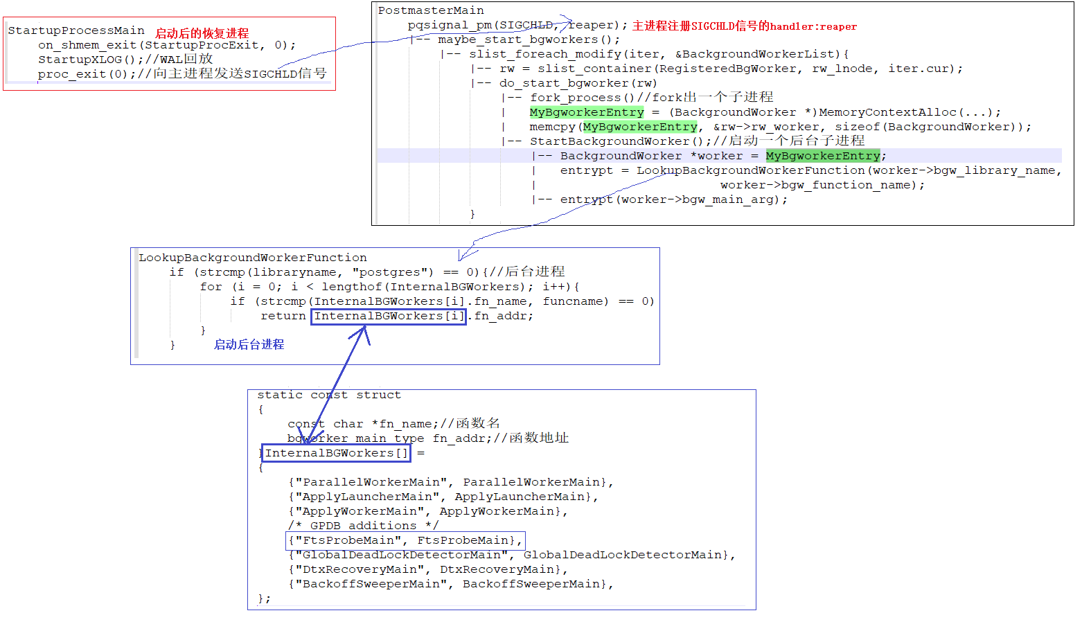 这样,结合第一个逻辑图,PostmasterMain->reaper函数从BackgroundWorkerList中取需要启动的进程进行启动,完成FTS的进程启动。