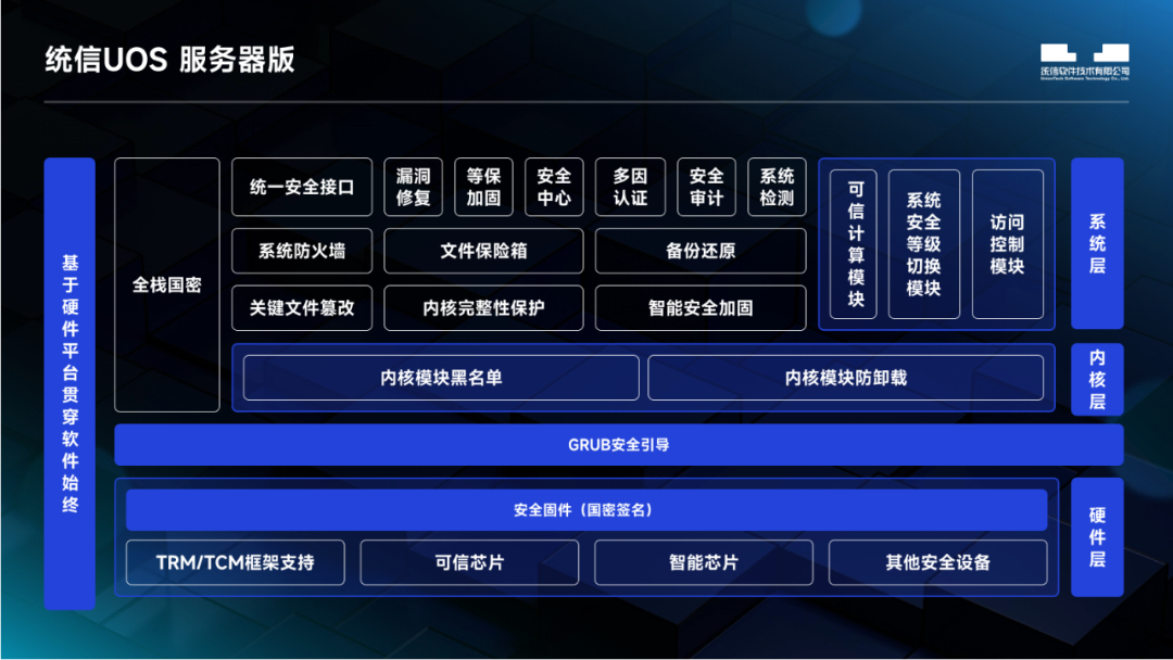 深耕基础软件领域20年,统信软件基于分层分类的理念和算法,从自身安全、生态安全和供应链安全三个方面打造统信UOS服务器版的全栈安全能力。