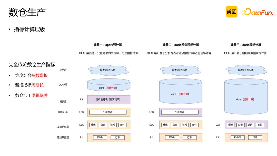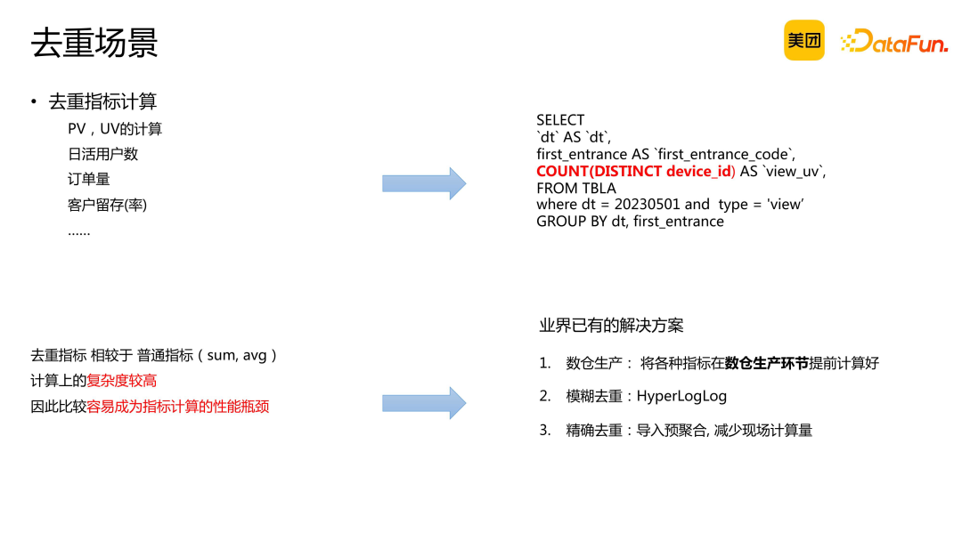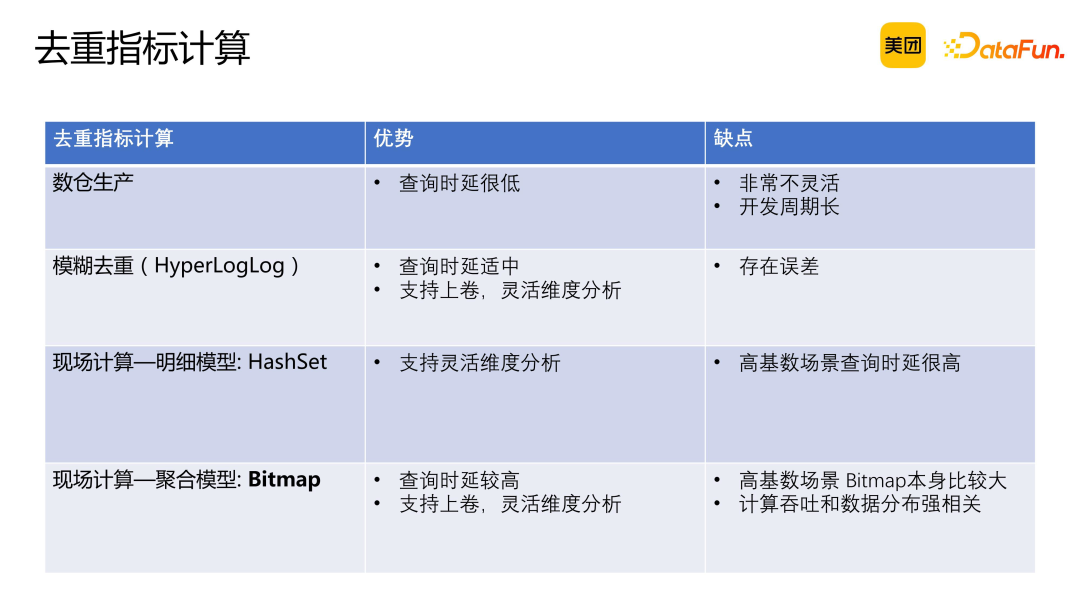 数仓生产:在 OLAP 引擎现场计算能力出现之前,去重指标的计算可以在数据仓库生产环节完成。数仓中预先计算好指标数据,查询时相当于 online 引擎直接获取提前计算好的结果数据。 模糊去重替代:相较于精确去重,模糊去重具有更高的聚合吞吐量。在某些场景下,可以用模糊去重结果替代精确去重。 预聚合处理:在导入数据时进行预聚合,构建预聚合模型以减少现场精确去重的计算量。通过优化聚合模型,确保精确去重的处理速度。