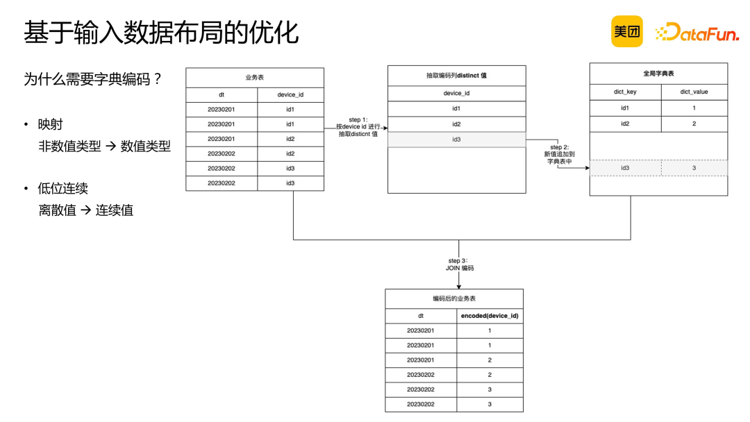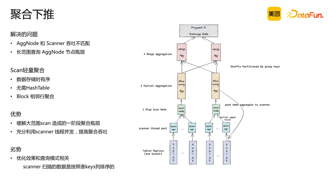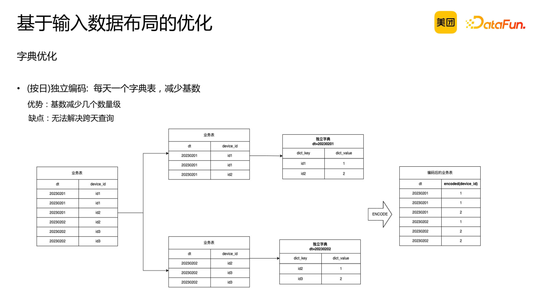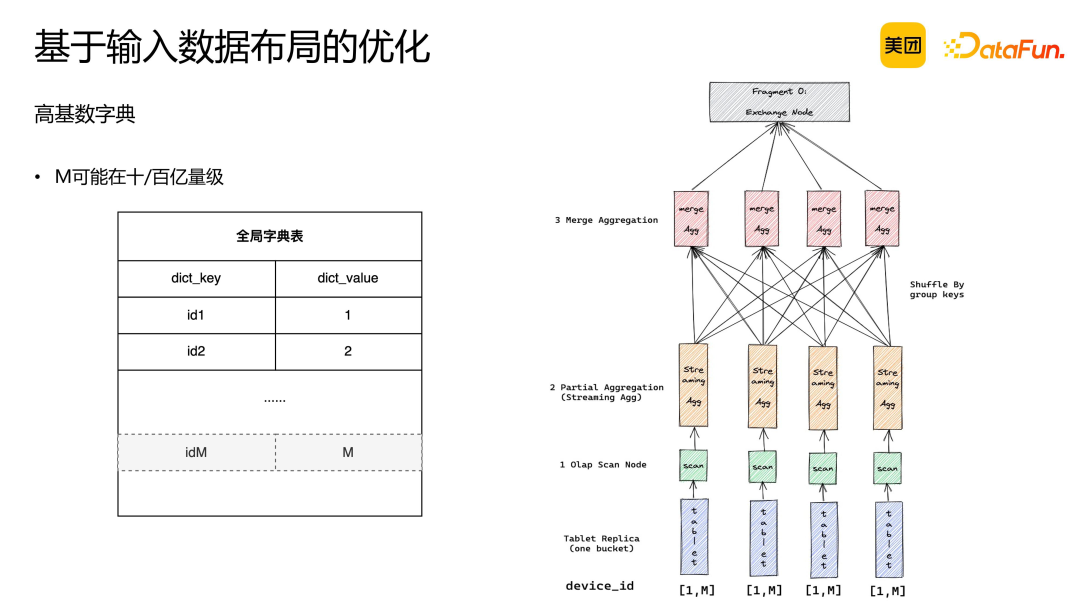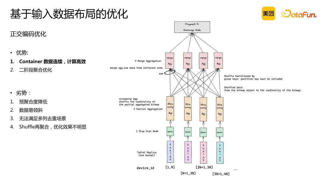 数据按此方式分布,预聚合度较低。因为按照设备 ID 区间分桶,无法保证所有相同 key 的数据集中在同一区间从而分入同一个桶在桶内聚合。 冗余倾斜问题。不同设备产生的数据量不同,可能导致某些 device ID 的数据量较大,而其他设备的数据量较小。 无法满足多列去重场景。例如,若需按 device ID 和 user ID 进行区间分桶,则无法实现正交。 该优化方法基于一定的前提假设,即数据从 tablet 读取后直接进行聚合。若涉及中间 join 操作和 shuffle 过程,则该前提假设不成立,优化效果将减弱。因此,此优化方法对于单表场景具有显著优势。