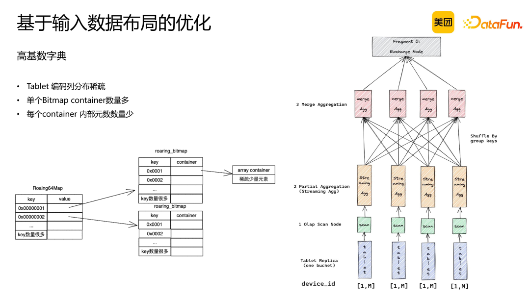 在一阶段聚合预算过程中,Doris 基于分片数据进行计算。如果 tablet 中的数据连续,则会形成 Bitset Container,从而提高计算效率。 在二阶段聚合过程中,不同 tablet 中的数据天然无交集。因此,二阶段仅需将一阶段 shuffle 过来的结果相加即可,无需进行 merge 计算。