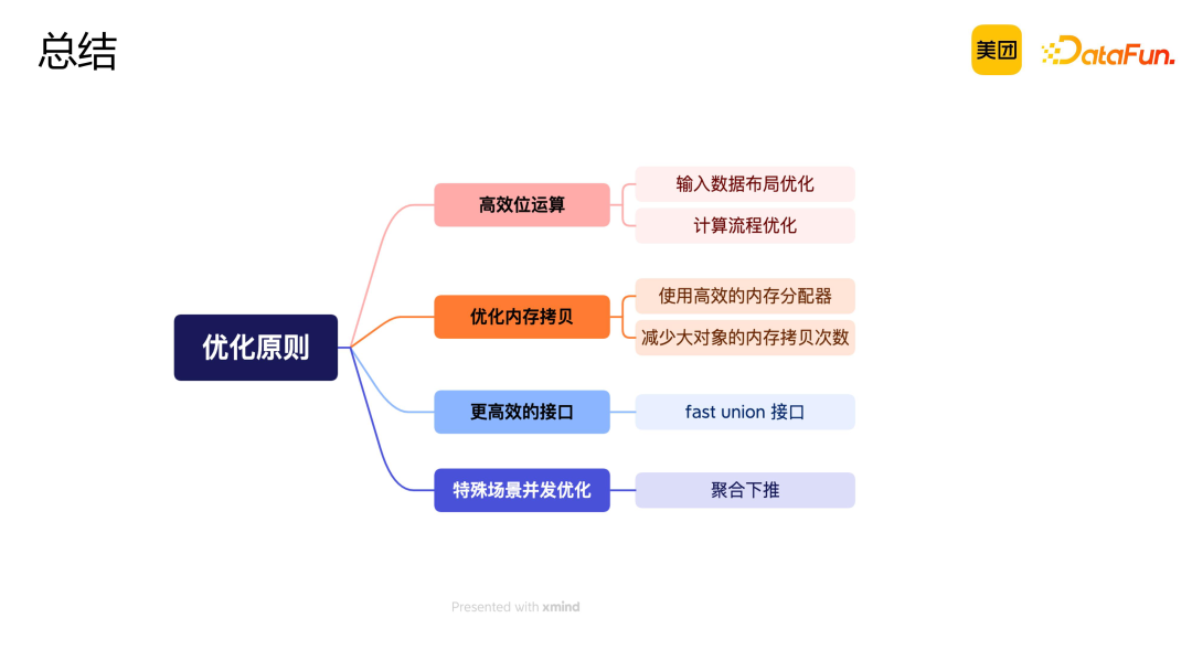 使用高效的位运算:优化分为两部分。第一部分是针对输入数据的布局进行优化,提高数据处理效率;第二部分是对 bitmap 计算流程进行改造,提高计算性能。 内存优化:使用了更高效的内存分配器和锁机制,降低了内存分配和同步的开销。同时,利用 bitmap 的 copy-on-write 特性,减少了不必要的内存拷贝。 支持 bitmap 的 fast union 接口:通过 fast union 操作,提升去重计算吞吐性能。 聚合下推优化:针对特殊场景,通过并发优化聚合下推过程,进一步提高了性能。