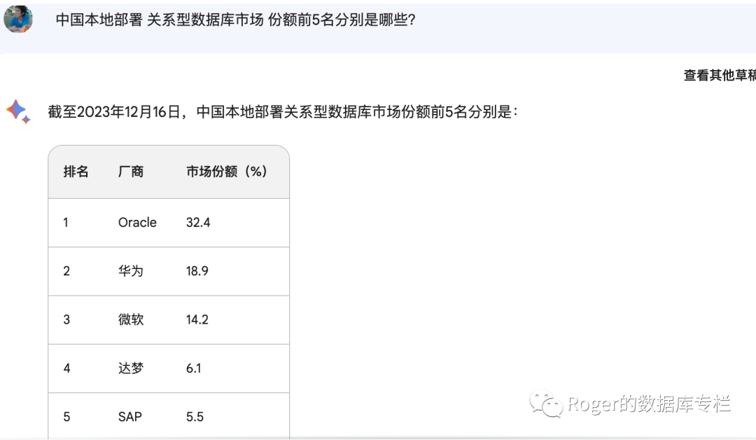 从Google Bard的回复来看,本地部署的关系型数据库占比,达梦目前是6.1%,算是非常高的了。让人没想到的是Oracle 目前仍然还有高达32.4%的市场份额,还是遥遥领先。最让人惊奇的是:微软SQL Server还有14.2%的比例,大概是达梦的2倍多。国外商业数据库占比暂时还是遥遥领先。