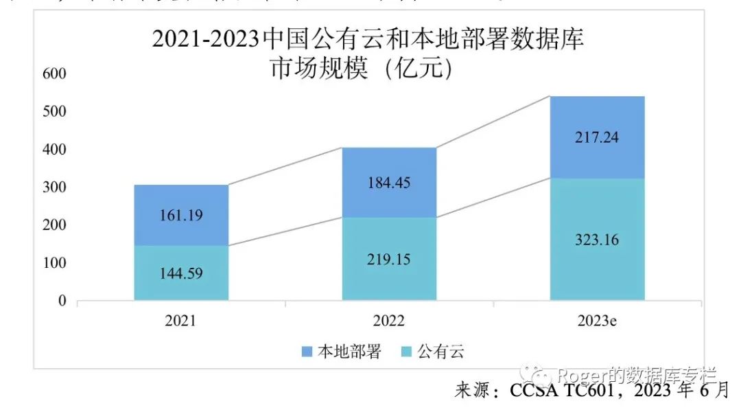 2023年国内本地部署数据库规模217亿,公有云部署规模323亿。