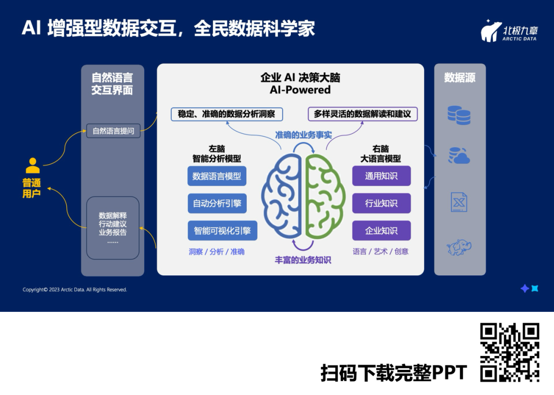 数据分析语言模型把准确的数据分析结果和洞察传递给大语言模型,大语言模型基于通用知识、行业知识、企业知识,结合数据分析结果,给出决策建议,并以简单易懂的语言形式返回给用户。