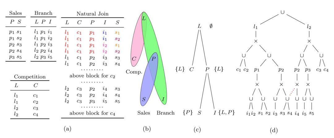 基于这样的思路,牛津大学的Dan Olteanu等人设计了因式分解数据库,尝试利用因式分解的能力来降低关系数据库的冗余从而优化空间和时间复杂度。下图是一个例子,(a) 表示了一个三张表的连接查询,以及它的查询结果。(b) 是这个连接查询超图;(c) 是这个连接查询的一个 d-tree (后文会解释);(d) 是这个这个连接查询的因式分解的表达式树。