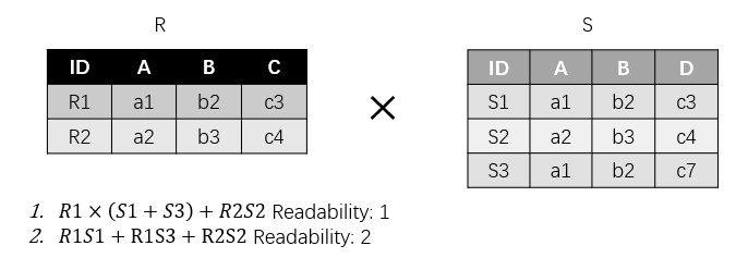 例如,下图的连接查询,用 1 的表示形式每个元组出现的次数为 1 次,因此它的Readabilty是1。而2的表示形式,R1 出现了两次,因此它的 Readability 是 2。