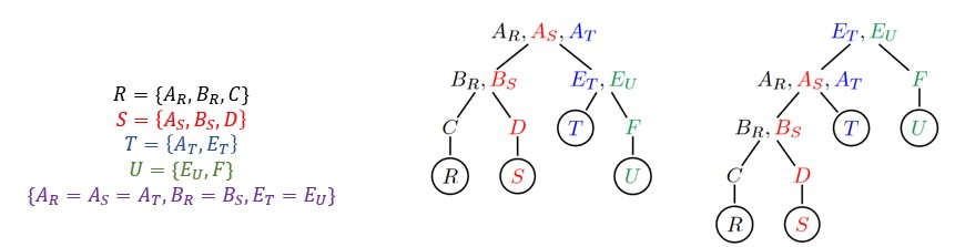 对于一个连接查询,我们要获得它的因式分解的表示形式,第一步是构建出连接查询的F-tree。它类似于一个连接计划。它需要满足以下条件: