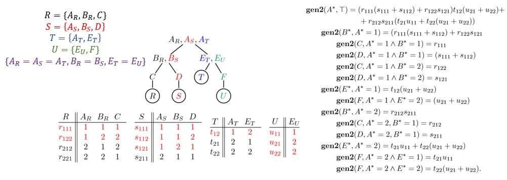 具体问题的问题定义为:给定关系型数据库,对于连接查询(Conjunctive query) 求得它的因式分解表示形式。 由于因式分解表示形式不唯一,因此我们要求结果尽可能紧凑。