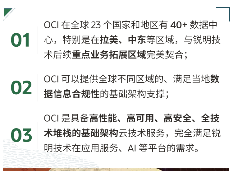 基于以上需求,锐明技术经过精心选型,最终选择了 Oracle 云基础设施远程软件服务(Oracle Cloud Infrastructure, OCI)作为其基础架构。