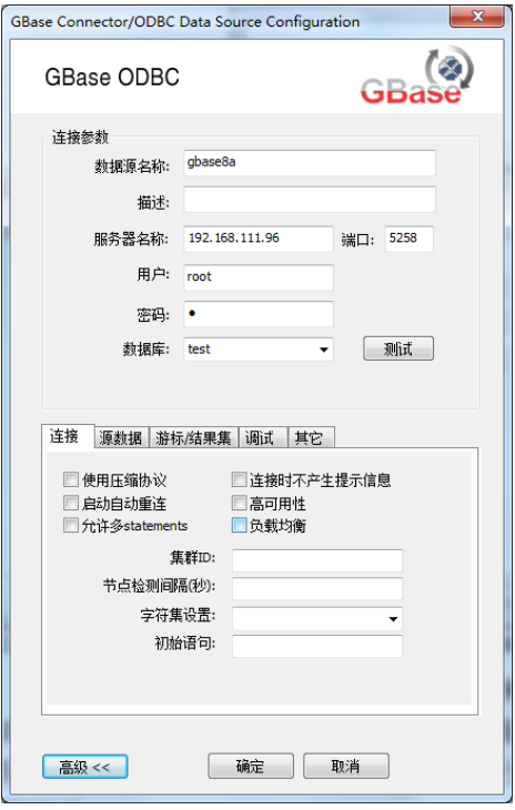 选择用户想修改的 GBase 数据源,然后点击配置。会出现 GBase 8a ODBC Driver 驱动程序- DSN 配置对话框;