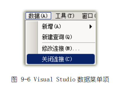 在创建的子节点上点击右键后会弹出菜单,选择‚关闭连接‛命令后,当前连接即被关闭。此时节点前图标会变为 代表此连接已关闭。‚关闭连接‛命令同样可以在选择节点后,GBASE南大通用Visual Studio 出现的‚数据‛菜单中选择。如下图9-6 所示。