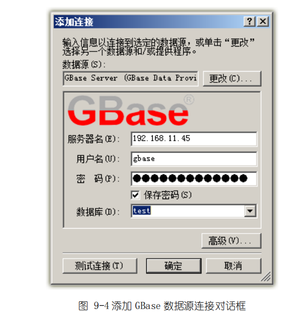从列表中选择‚GBASE南大通用项目后,则会弹出‚添加连接‛对话框,如下图 9-4。如果验证信息输入正确并且点击确定按钮后会自动打开数据连接,并且会在‚数据连接‛节点下新增一个子节点,以 IP(Database)格式命名,如:192.168.11.45(test)。此后的操作都会在此子节点上进行。如:创建表、视图、存储过程、函数、UDF 等。
