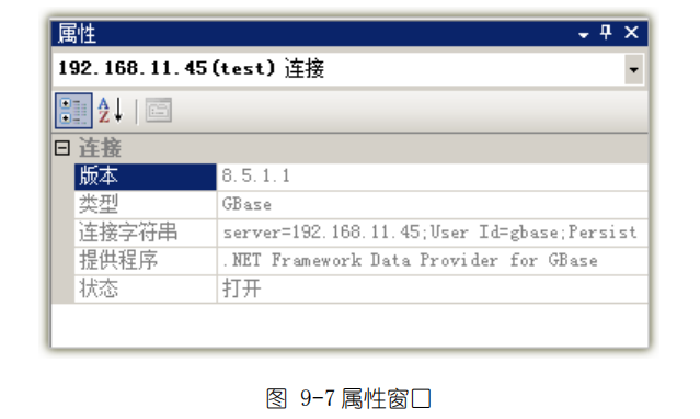 在服务器资源管理器中新增了 GBASE南大通用数据库数据源节点后,如果要查看当前节点使用的提供程序、版本、类型(厂商)、连接字符串、状态,GBASE南大通用可在点击创建的子节点后查看‚属性‛对话框。如下图 9-7 所示。如果‚属性‛窗口没有显示在当前视图,可以从 Visual Studio 的‚视图‛菜单中选择‚属性窗口‛。