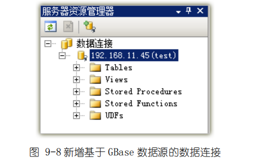GBASE南大通用在服务器资源管理器中新增了 GBase 数据源节点后,此节点如果不手动删除,则会自动保存,并且在下次打开 Visual Studio 时会同样显示在此位置。如下图 9-8。