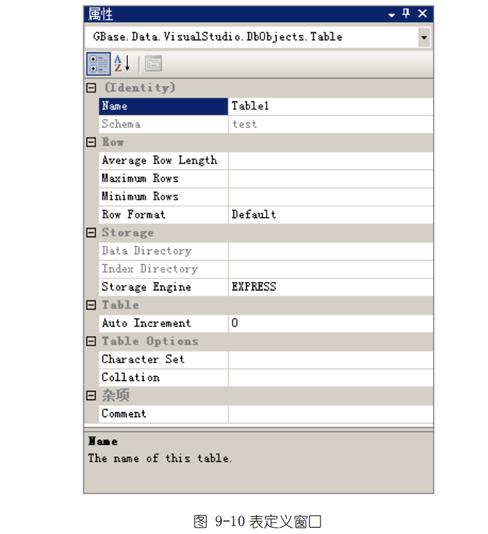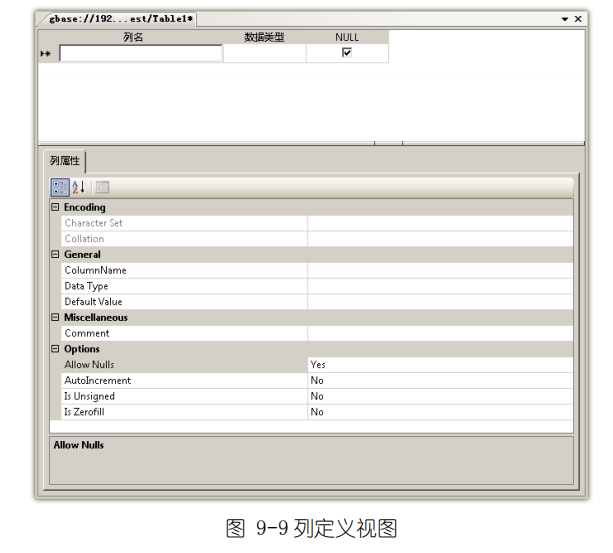 在 Tables 节点上点击右键选择‚创建表‛命令或者执行 Visual Studio 的‚数据‛菜单的‚新增‛子菜单下的‚表‛命令,则会显示列定义视图(图 9-9)和表定义窗口(图 9-10)。列定义视图分为上下两部分,上面部分输入列名、数据类型等基本信息,下面部分输入列的更详细定义。