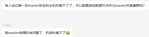 有人试过唯一的 master 所在的主机恢复不了了,可以配置其他数据节点作为 master 恢复集群吗?