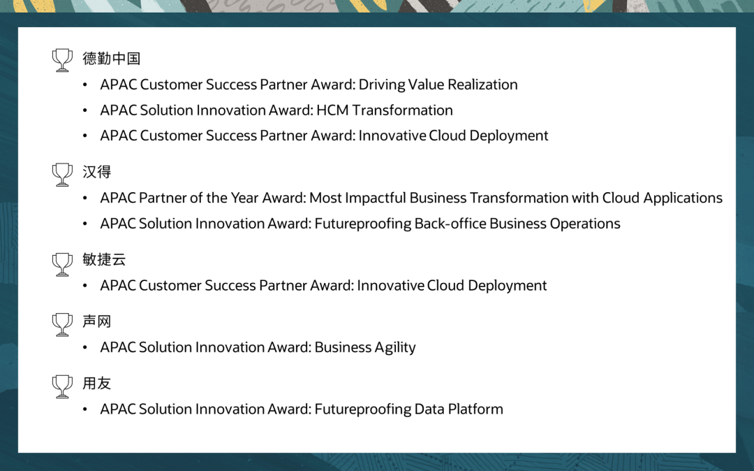在合作过程中,合作伙伴们充分发挥了自身的专业知识与技术优势,为客户提供了优秀的解决方案和技术支持。他们的贡献帮助甲骨文在中国的业务发展和提升客户满意度起到了积极的推动作用。