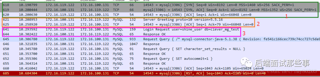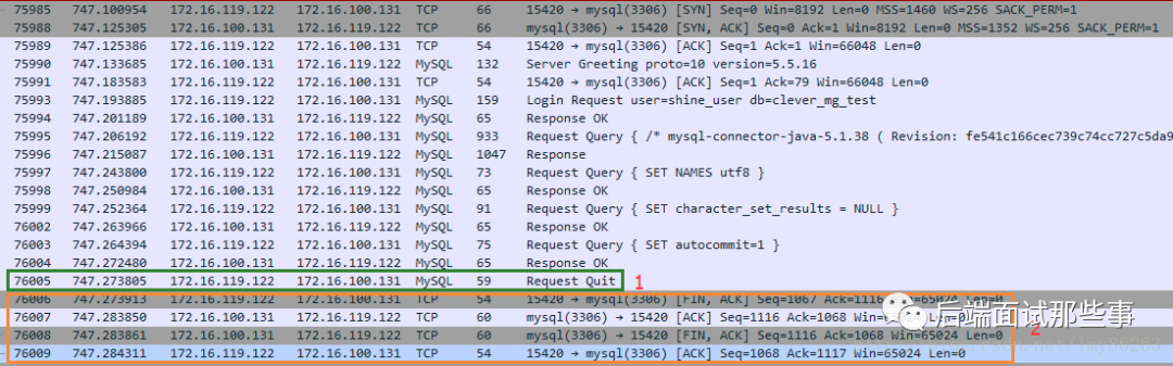 Connection.close()关闭的,而是由于程序执行完毕,导致进程终止,造成与数据库的连接异常关闭,所以最后会出现TCP的RST报文。在这个最简单的代码中,没有设置任何额外的连接属性,所以在设置属性上占用的时间可以认为是最少的(其实,虽然我们没有设置任何属性,但是驱动仍然设置了字符集、事务自动提交等,这取决于具体的驱动实现),所以整个连接所使用的时间可以认为是最少的。但从统计信息中可以看出,在不包括最后TCP的RST 报文时(因为该报文不需要服务器返回任何响应),但是其中仍需在客户端和服务器之间进行往返7次,也就是说完成一次连接,可以认为,数据在客户端和服务器之间需要至少往返7次,从时间上来看,从开始TCP的三次握手,到最终连接强制断开为止(不包括最后的RST报文),总共花费了: