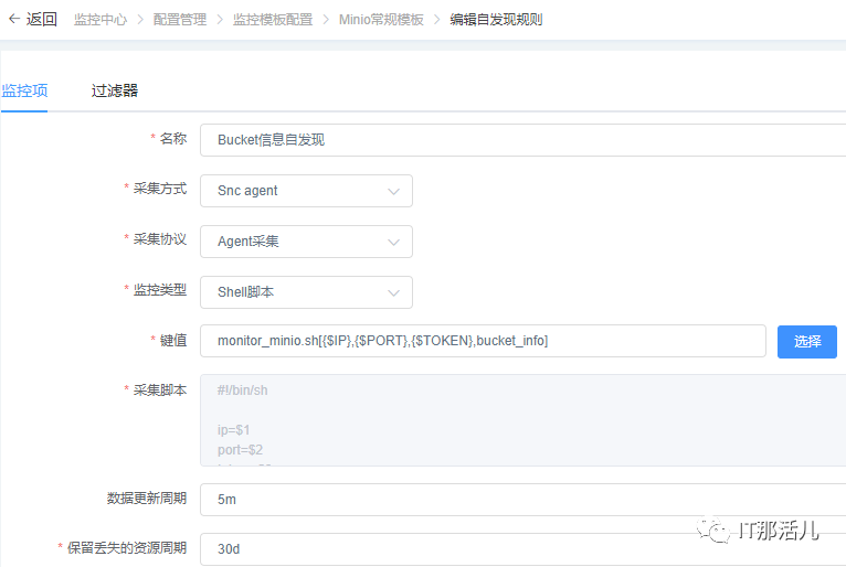 minio中的bucket信息和api信息由于不是唯一性,故做成自发现指标,在自发现规则里创建。