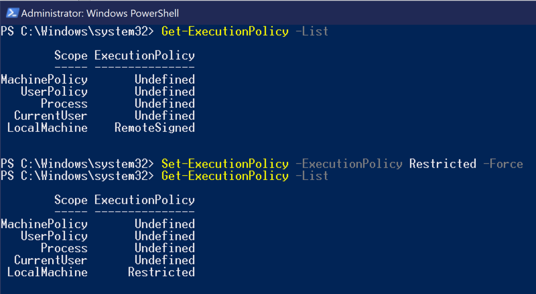 【3】对于 PowerShell 的脚本执行策略,Windows 客户端默认配置为禁止(Restricted),Windows 服务器默认配置为对于 Internet 下载的脚本文件要求签名(RemoteSigned);