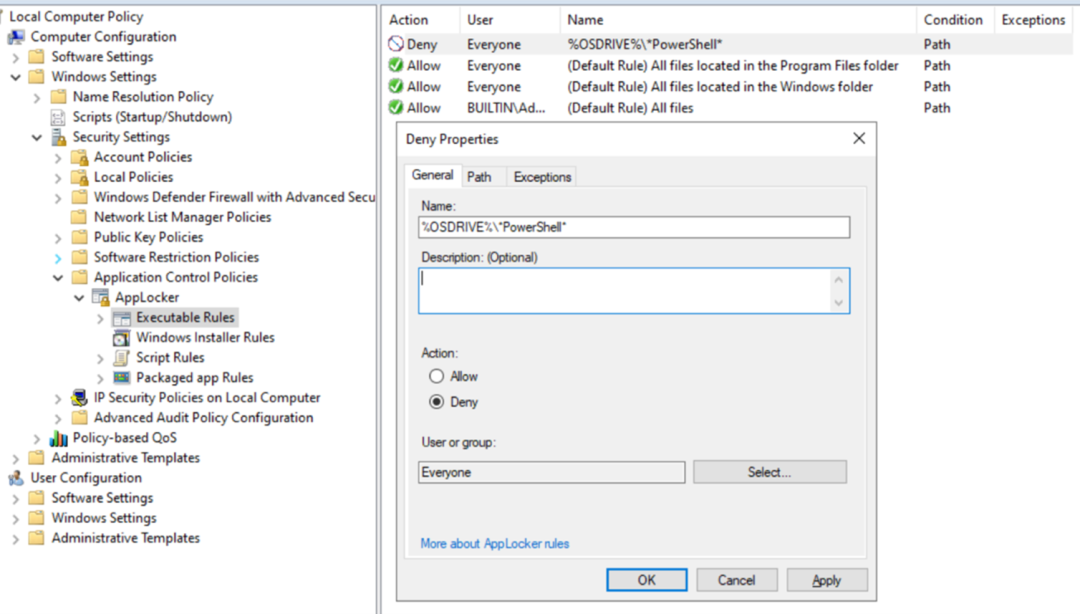 在 PowerShell 执行策略中禁止执行脚本不会限制执行 PowerShell 程序,因此对于安全要求较高的计算机系统,可以考虑直接通过 AppLocker 策略来禁止运行 PowerShell 相关进程,如下图所示。但是 AppLocker 的 Executable Rules 这种路径限制类规则均无法限制文件夹/文件复制或改名,因此需要结合其他安全防护措施一起使用,否则该限制策略可以被绕过。