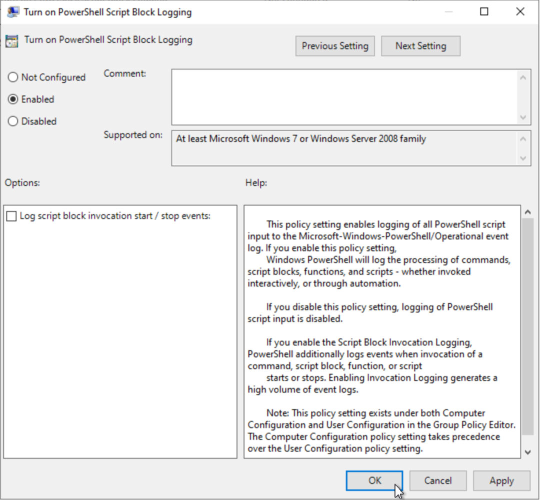 其中最重要的是启用 PowerShell Script Block Logging,如下图所示: