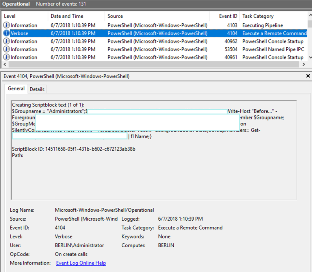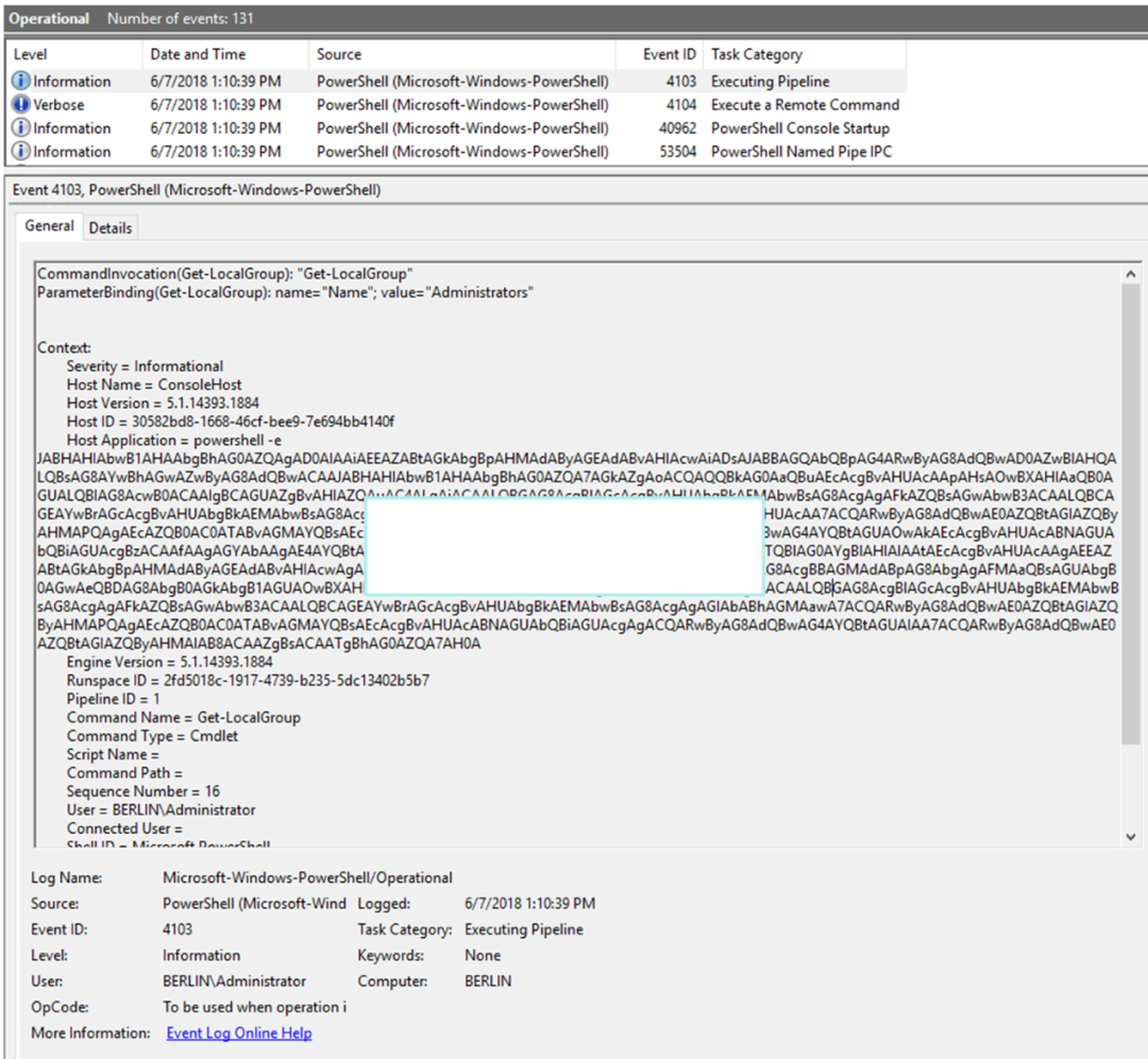 PowerShell Module Logging 可以记录所有或特定 PowerShell 模块中的具体每条命令的执行情况和部分输出结果,无论通过单条命令调用,或者通过脚本执行调用,均会正常记录到日志中,包括记录调用脚本的具体路径和实际调用参数值,但不记录变量转换过程及名称,如下图所示。如果单条记录超出日志记录限制,则会生成多条日志。相关日志记录到Microsoft-Windows-PowerShell/Operational 日志中,启用该日志记录会产生大量的日志信息,建议调整该日志的存储限制到256MB。