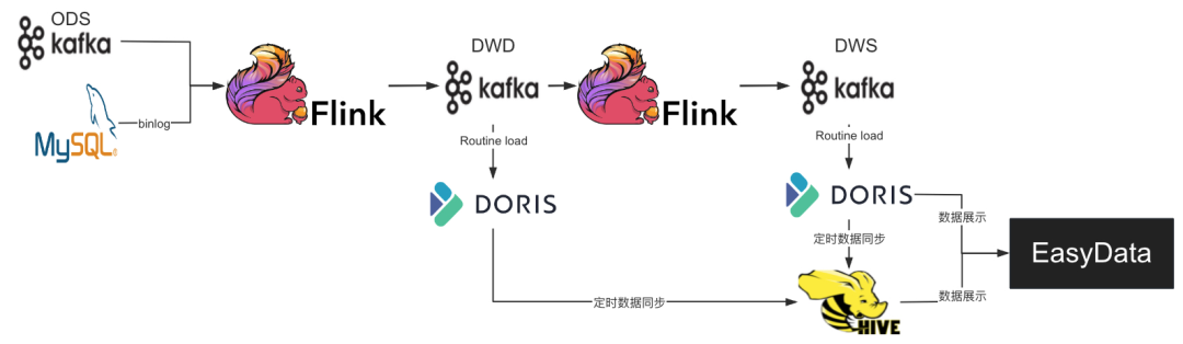 有道的数据层架构可分为离线和实时两部分,离线计算主要采用Hive、Spark,采用批处理的方式定时调度。实时部分采用 Flink+Doris(版本 0.14.0)构建实时数仓,用于处理实时埋点日志、业务库变更数据。ODS 层数据源为 Kafka 埋点日志、数据库业务数据,DWD、DWS层数据通过Flink计算引擎加工,写入 Doris 中。同时将 Doris 数据定时同步至 Hive,用于离线调度计算。该架构存在如下问题: