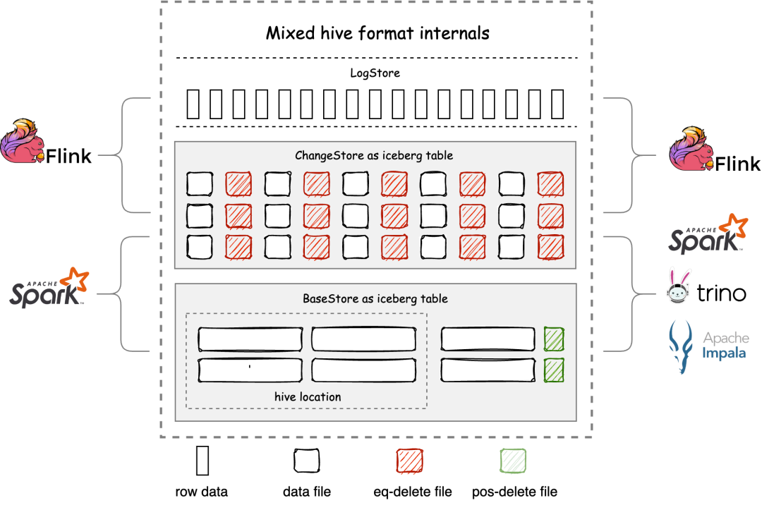 schema、partition、types 与 Hive format 保持一致。 使用 Hive connector 将 Mixed Hive 表当成 Hive 表来读写。 可以将 Hive 表原地升级为 Mixed Hive 表,升级过程没有数据重写和迁移,秒级响应。 具备湖仓一体的特性,包括基于主键 upsert,流式读写,ACID,time travel 等功能。