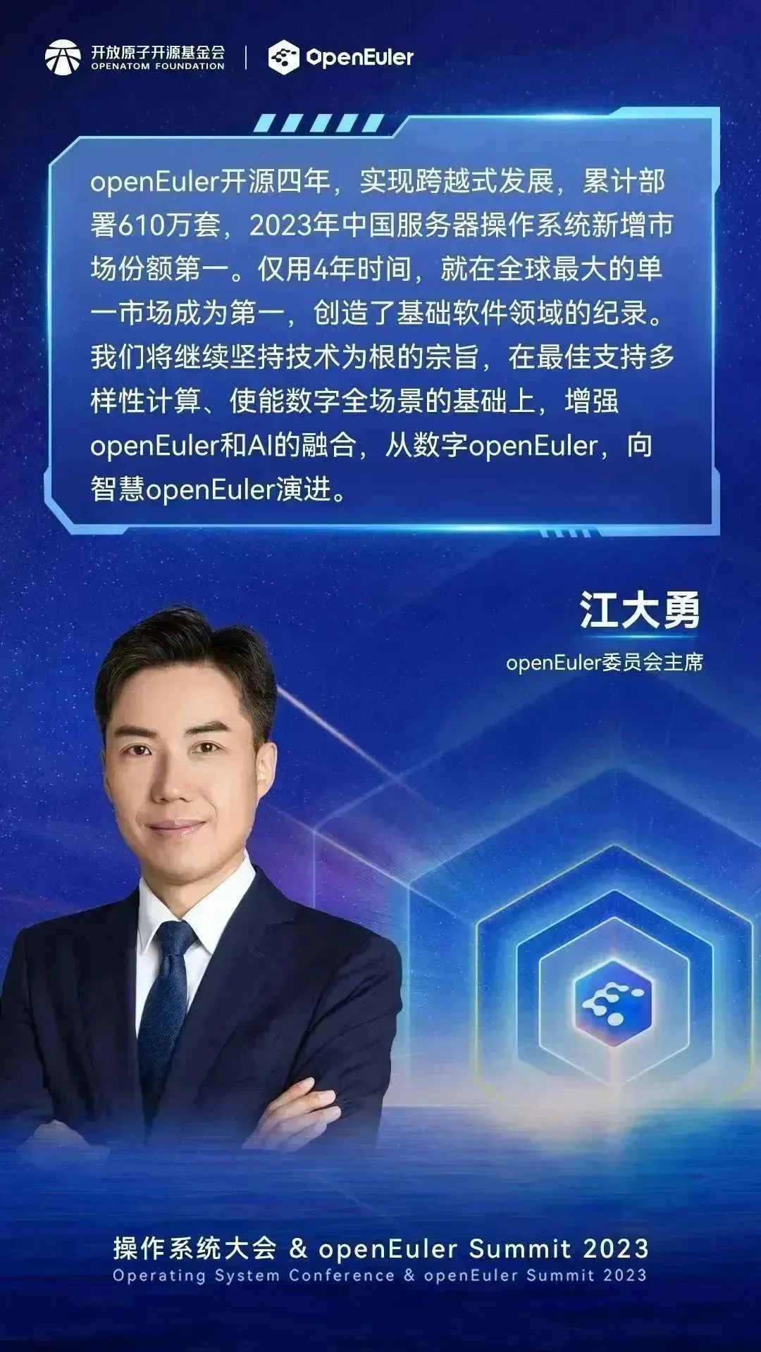过去一年,欧拉加速发展。截至目前,欧拉系累计装机量超过610万套,根据IDC预测,2023年openEuler系在中国服务器操作系统市场份额达到36.8%。开源四年,欧拉实现了跨越式发展,成长为中国第一服务器操作系统,并在技术创新、生态发展、社区合作、商业落地上建立了完善的发展体系,形成了产业正循环。欧拉成为中国首个达成市场份额第一的基础软件,这是中国基础软件产业发展的重要里程碑,为数字中国打造了坚实可靠的软件底座。