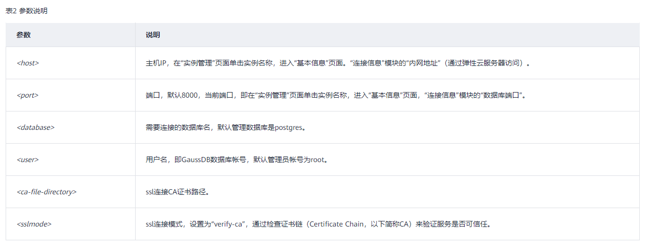 gsql -d postgres -h 10.0.0.0 -U root -p 8000