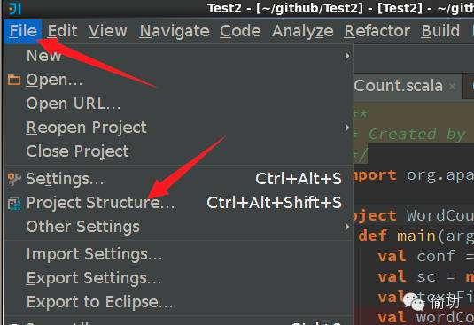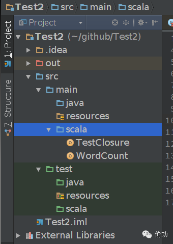 在此使用WordCount作为案例,在IDEA中构建一个工程,并创建objectWordCount。工程的目录结构如下所示: