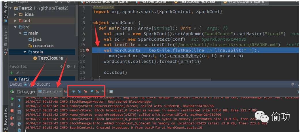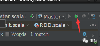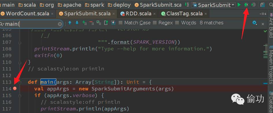 在SparkSubmit的main方法中设置断点,点击右上角的调试按钮: