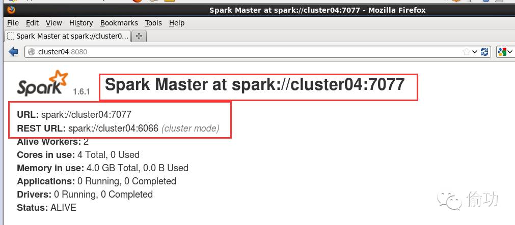 其中,spark://cluster04:7077对应为Master的URL信息,在8080端口界面上可以查看。