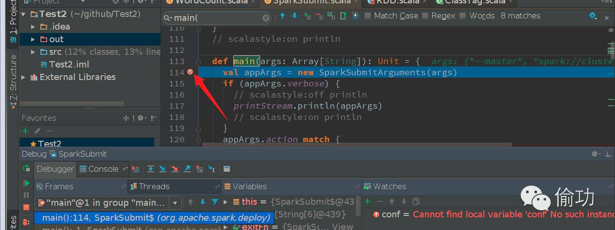 运行后会停在SparkSubmit设置的断点上,如下所示: