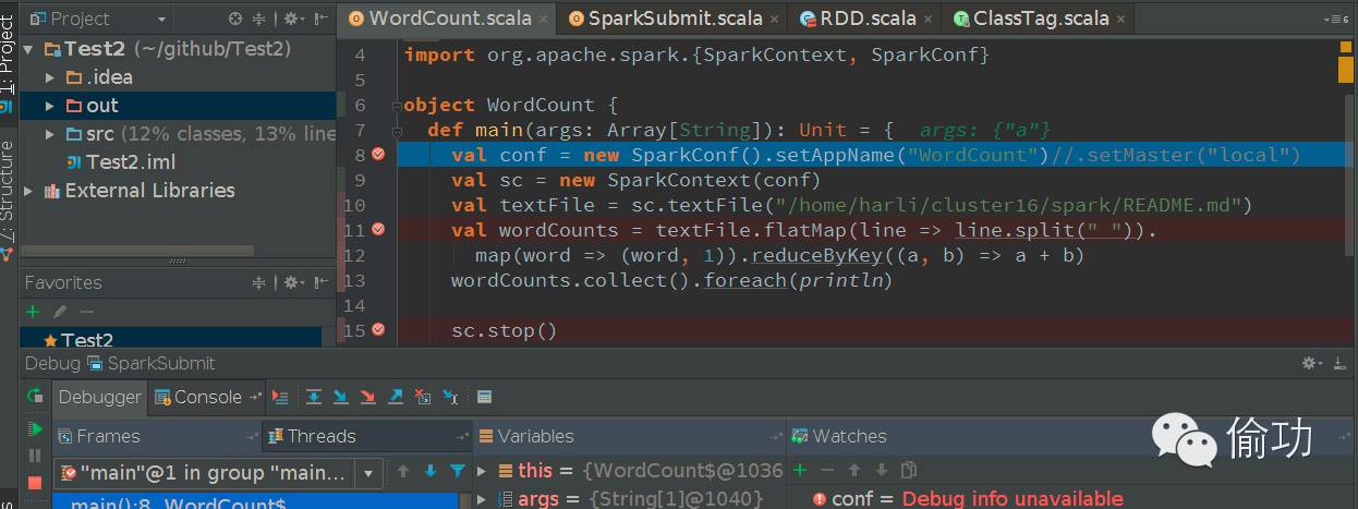 此时可以在SparkSubmit中设置断点,也可以直接在应用程序中设置断点。