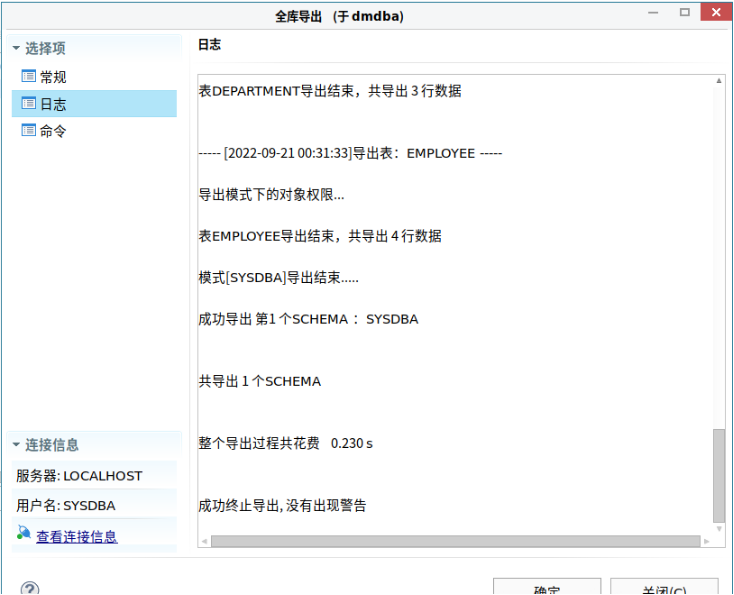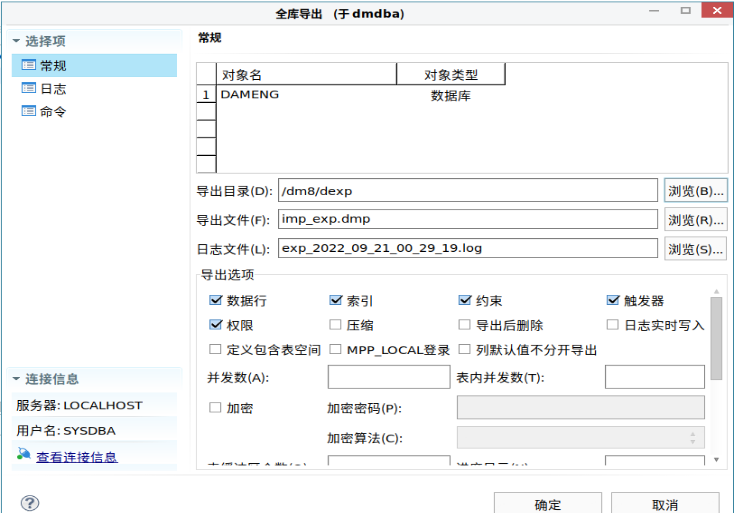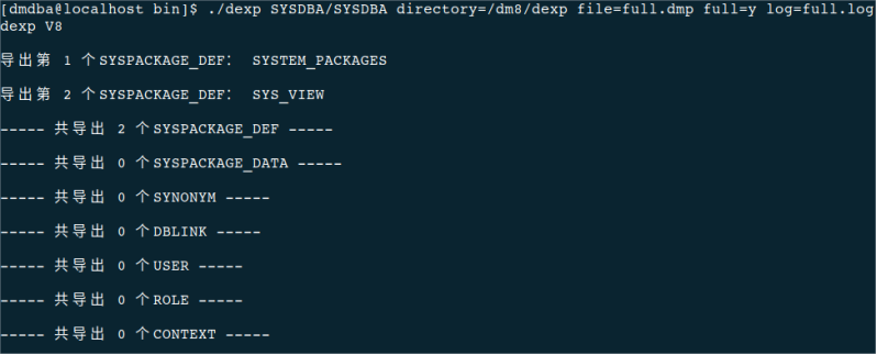 ./dexp SYSDBA/SYSDBA directory=/dm8/dexp file=full.dmp full=y log=full.log